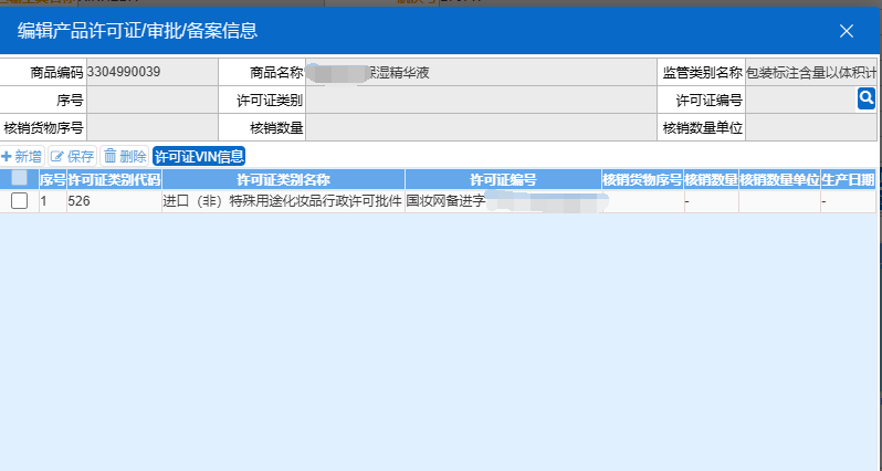 对于国家实施注册或者备案的化妆品,申报界面的“产品资质”项下“编辑产品许可证/审批/备案信息”框中“许可证类别”录入类别代码“526”,选择“526-进口(非)特殊用途化妆品行政许可批件”,并在“许可证编号”栏中录入国家药监局进口特殊化妆品注册证号或普通化妆品备案号。