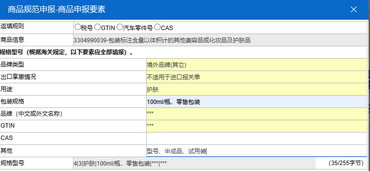 进口化妆品套装,可在申报界面的“规格型号”项下填写“套装”。